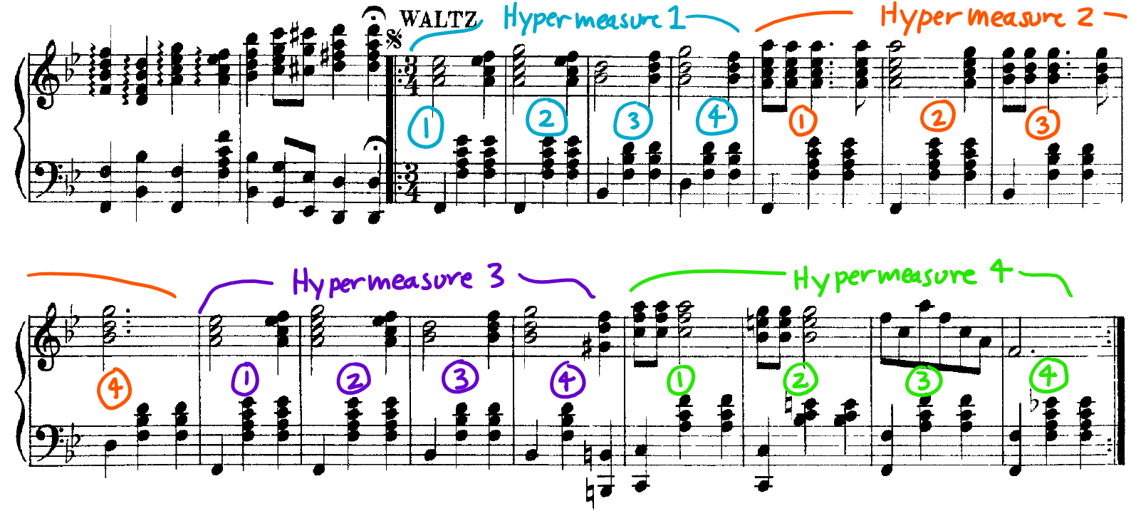 In this example (click the image below), the end of the 1st phrase elides with the beginning of the 2nd phrase in measure 12. The music from the 3rd hypermeasure is just like that of the 2nd hypermeasure, so use the 2nd one as a model for how the 3rd should go. Listen how measure 12 still functions as the end of the 1st phrase but the new phrase really takes over, which provides a clear sense of the beginning of a new hypermeasure. Note that the notation 4=1 in the measure where the hypermetric reinterpretation occurs.